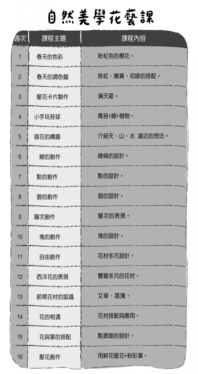 | 費用 | 16堂/6000元,另計花材費$1200(請假無法扣除花材費) |