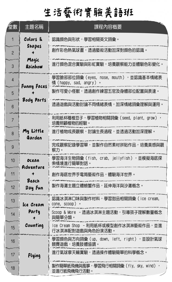 「生活藝術實驗美語班」以孩子熟悉的生活情境為主軸,結合藝術創作、簡單實驗與美語學習,讓孩子在實際操作與探索中,自然接觸英語、勇敢開口說。