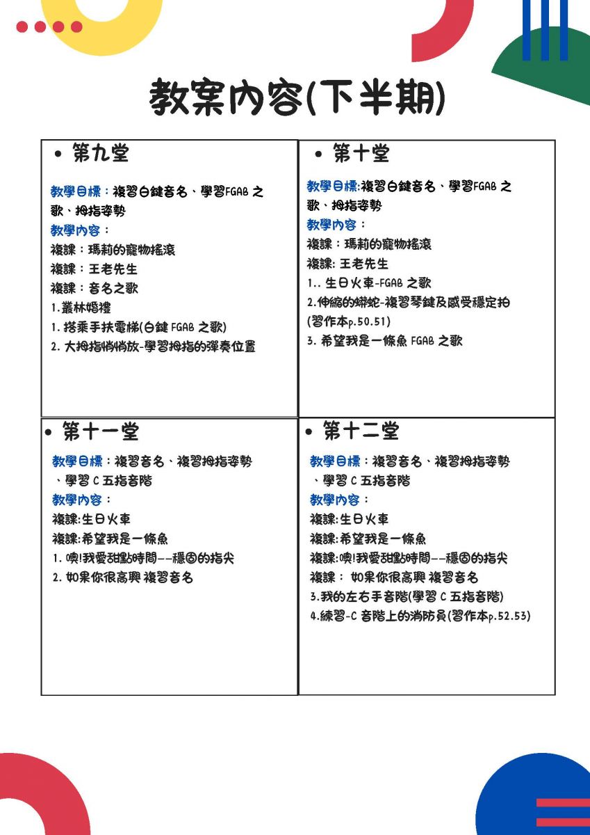 | 老師介紹 | 任職經歷~ YAMAHE專任講師 YAMAHE監考官 YAMAHE鋼琴演奏級Grade4 YAMAHE鋼琴指導級Grade5 YAMAHE擔子琴演奏級Grade4 比賽經歷~ 代表台灣參賽日本YAMAHE JOC YAMAHE優勝 |